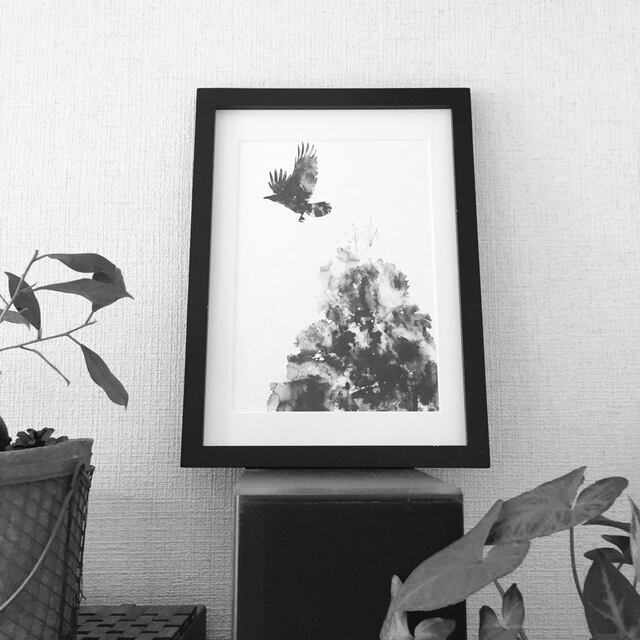 スギの木から飛び立つカラスを描いたモノクロアートポスター。