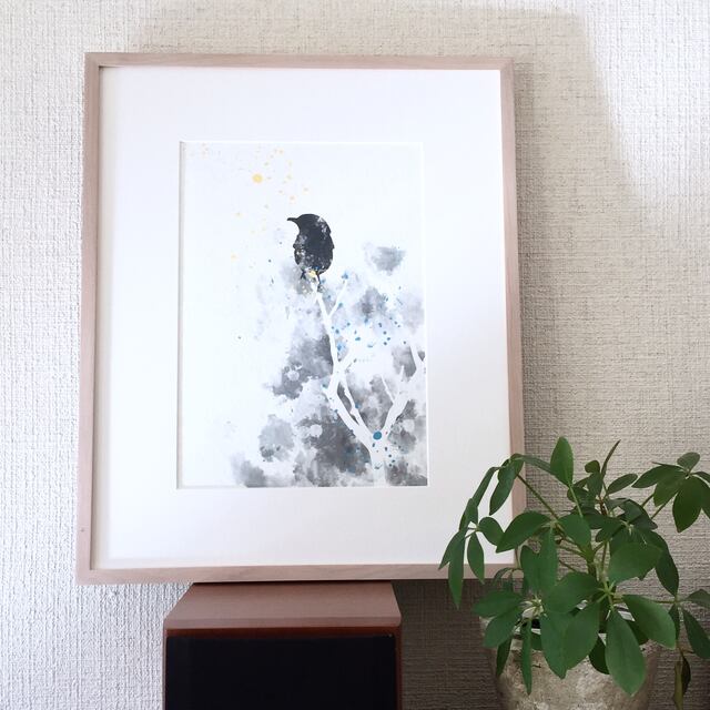 枝の先にとまった小鳥がどこか遠くを見つめる、詩情漂うアートポスターです☺︎