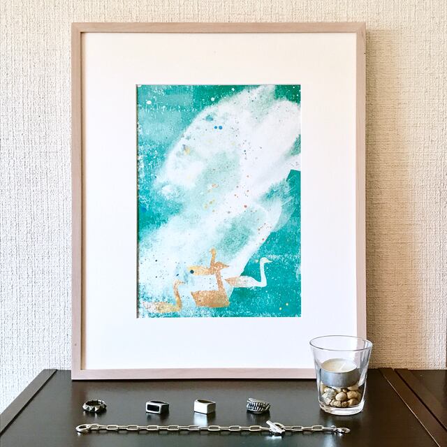 深いブルーグリーンの湖と、優雅に浮かぶ白鳥を描きました。